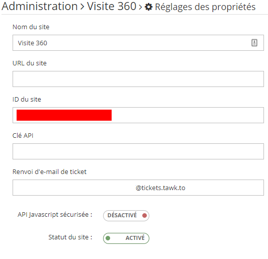 Dans votre interface tawkTo, partie "Administration" (roue crantée en bas à gauche), puis "Réglage des proprietés", copier l'id dans la case "Id du site" :