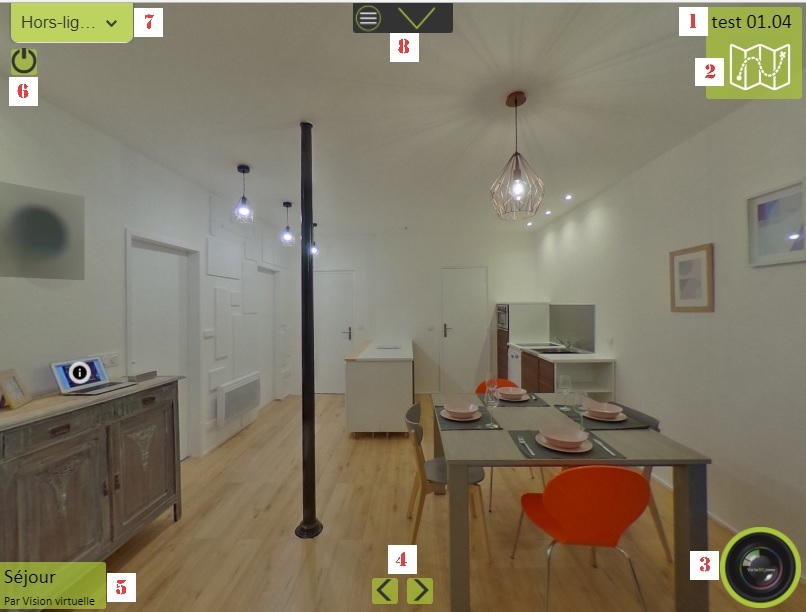 - Vous avez la possibilité d'ajouter un plan (image statique), et une description d'un projet, et de chaque panorama du projet. En visualisation, le plan sera visible grace à l'icone de carte en ahaut à droite, la description du bien en cliquant sur le nom du projet au dessus, et la description de la piece en cours de visualisation en cliquant sur le nom de la piece, en bas à gauche.